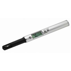 | 小型・軽量・簡単操作の温湿度計・露点計です。 単三アルカリ乾電池1個で使用できます。 倉庫内の簡易温湿度チェックに! 風邪、インフルエンザ、熱中症予防対策に! 労働環境の安全管理やスポーツの安全管理に! ■特長 ●小型サイズのペン型温湿度計 ●丈夫なクリップ付メタルボティ ●最高・最低温湿度表示・ホールド機能付 ●パックライト付 ●露点演算機能付 ●オートオフ機能切替 ■仕様